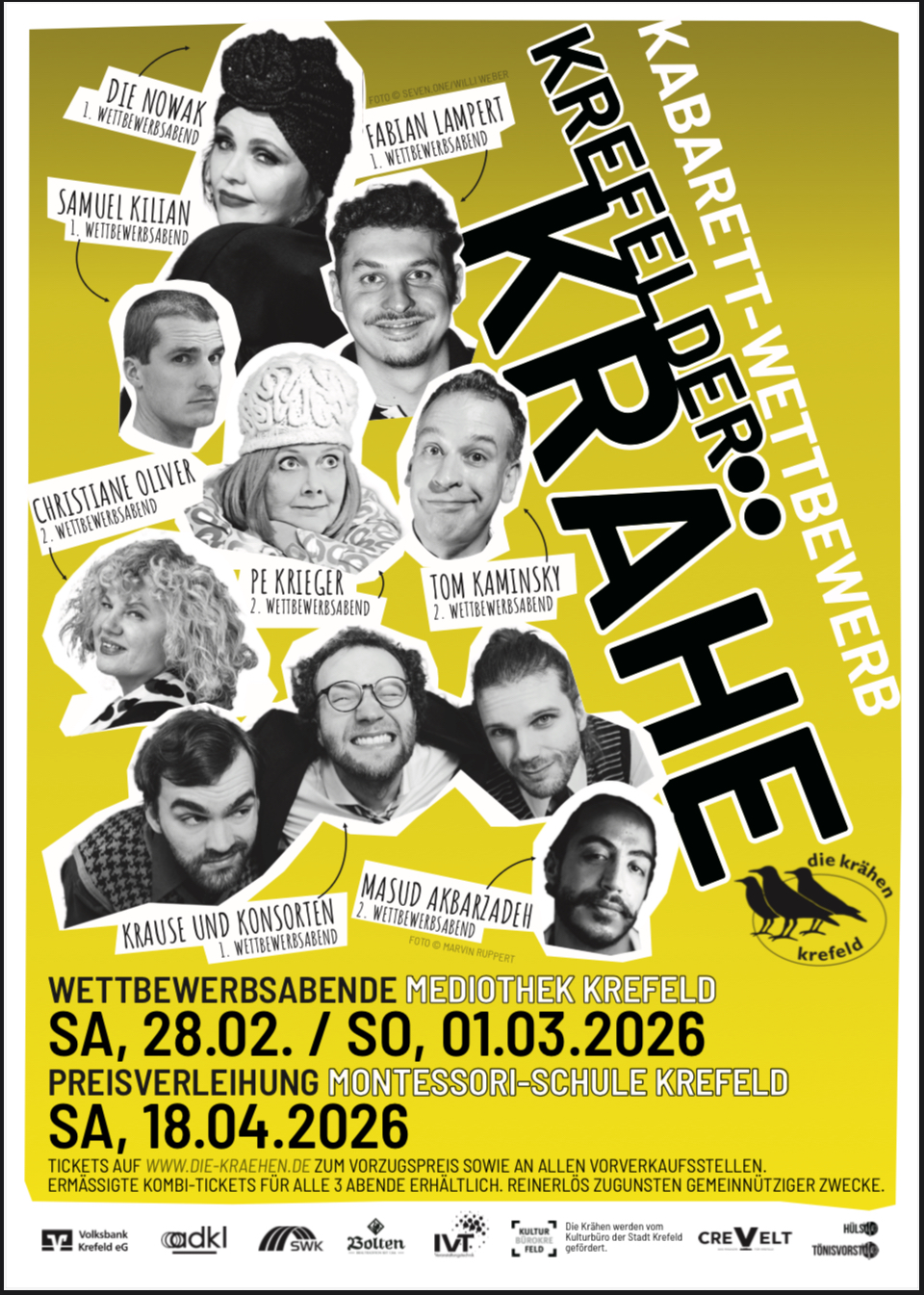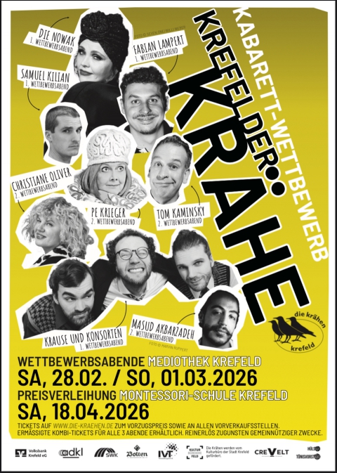 Seit 20 Jahren gibt es in Krefeld einen der bedeutendsten Kabarettpreise Deutschlands: die Krefelder Krähe. Der Preis findet im Wechsel von Ehrenpreis und Nachwuchspreis (Wettbewerb) statt. Im Frühjahr 2026 ist wieder der Nachwuchspreis an der Reihe. Die beiden Finalabende (Ausscheidungs-Wettbewerb der Top-8) finden in diesem Jahr in der Mediothek Krefeld statt. Das Publikum hat ein Drittel des Stimmrechtes, neben einer Fachjury und dem Krähen-Ensemble.